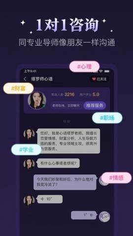 2、在这个应用程序中,您可以找到全球范围内最专业的心理咨询师和塔罗牌占卜师。