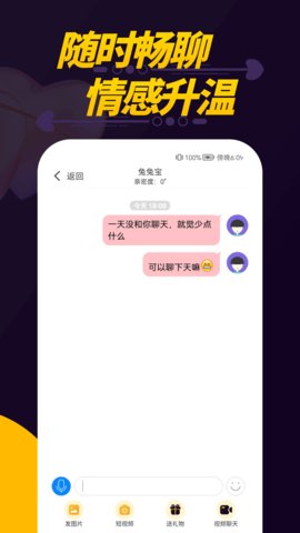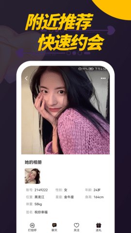 2、不管你是在本地还是异地,我们都提供24小时在线的呵护聊天,随时随地快速恋爱交友!这款软件专为千万实名男女打造,提供了视频聊天、聊天、交友、语音交友、脱单交友、恋爱视频聊天、同城约会等功能,满足你所有的需求。