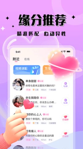 一见倾心交友软件是一款应用,用户可以通过该软件在朋友圈广场上了解附近的缘分。该软件提供了匹配推荐的附近异性的功能,让用户可以轻松发现属于自己的缘分。同时该软件还提供了附近聊天的功能,可以进行缘分匹配,快速开启聊天。