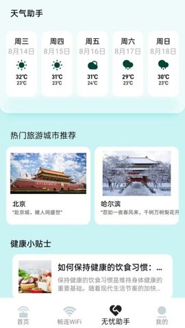 畅连无忧手机版的亮点在于其强大的定位功能,能够精准地定位用户的当前位置,并为用户提供准确可靠的实时天气和未来几天的天气预报信息。用户可以轻松了解所在地的天气变化情况,便于进行出行规划,为用户的生活提供便利。app还提供健康小贴士,帮助用户进行科学养生,让用户的生活更加健康。