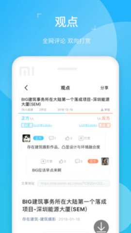 2、同时用户还可以对公众号文章进行打赏,对全章进行PK,展示自己的建筑观点。