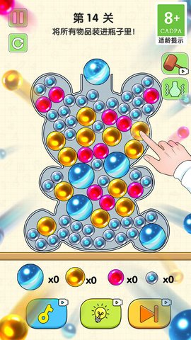 2、每个关卡都有一个空的瓶子和一些小球,玩家需要找到合适的方式将小球装满瓶子,同时避免小球掉落在外侧。
