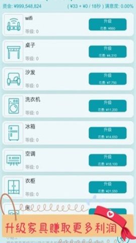 2、升级选项也非常丰富,可以升级房间、设备、员工等,提高民宿的服务水平。
