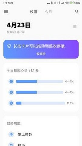 HITSZ助手App是一款应用,旨在创建一个便捷的移动办公平台,使用户可以随时随地进行移动办公。该应用的任务列表模块可以辅助用户进行表格操作。活动分为DDL、检查、事务提醒等四个方面,使用户不再需要打开日历或记事本来添加内容,从而简化操作。HITSZ助手App专为学生设计,为他们创造了一个移动生活应用程序。通过该软件,学生可以更好地管理各种日程,该软件拥有丰富的功能和全面的服务,用户可以轻松查询校园信息,并进行导航和操作。【教务与课表】28283为广大用户提供HITSZ助手App的下载服务。HITSZ助手App是专为大学生打造的校园生活助手软件,用户下载该软件后可以对自己的课表进行添加和管理,获取校内最新通告,查看课程进度,创建个人日程表,实现规范的校园生活管理。HITSZ移动办公具有消息、应用、I三大功能模块,用户可以通过该应用在线处理相应事务。【校园与导航】【任务清单和活动增列】模块支持在线结果查询、进度查询、系统公告、文档管理、调度等功能。我们开发了教务管理系统的移动端,并不断进行完善和功能研究,使其具备完整的信息功能和课程表。该应用不仅实现了主流社会第三方课表APP(如超级‘课程表、简课表等)的功能,还增加了科目整理、教师查询、教室查询等功能。在校园管理模块设计中,除了教务信息系统、空教室查询、失物招领等功能外,我们还加入了地点库和评分影响机制。同时我们将课程表与地点库相连接,使新生不再为找不到上课教室而烦恼,只需在课表中点击即可进入教室页面,一键开启教室导航功能。该应用提供了个人课表、教学管理信息、教师查询、学生学习信息、评教信息、学生成绩等教学工作服务。其中包括创建事项、审批和查询等功能,同时也能更好地管理和控制移动性能,及时处理办公室事务。