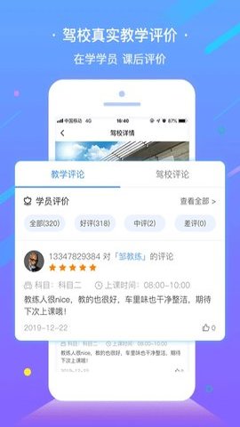 5、在使用e学e驾的过程中,学员还可以查看每个教练的真实评价,并在线监督教练的教学质量。