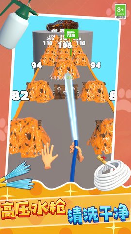 1、游戏的操作非常灵活,玩家只需点击手指,利用水管的水将各种脏物体冲洗干净。