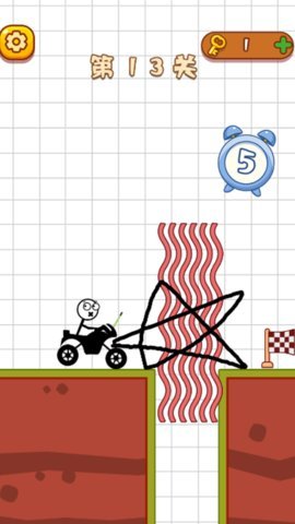 3、玩家需要在游戏中画出线条,制作桥梁和跳板,让摩托车顺利躲避各种机关陷阱,抵达终点。