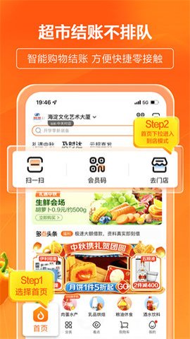 5、此外多点生鲜还提供了结账不排队的便利服务,用户可以通过手机自由购结账,或者使用自助收银机和智能购物车结账,快速结账不需要排队,避免了接触风险,让用户购物更加安心。