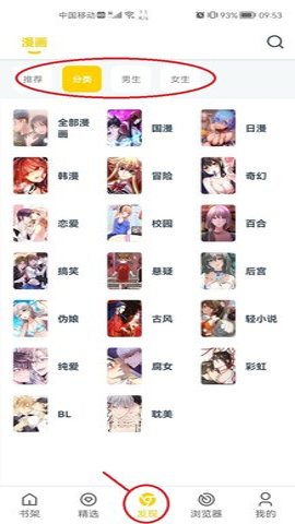 4、在应用中,你可以点击【发现】-【分类】,就能看到各种题材的漫画,支持校园、搞笑、悬疑、恋爱等各种类型,还有国漫、日漫、韩漫等供你探索。