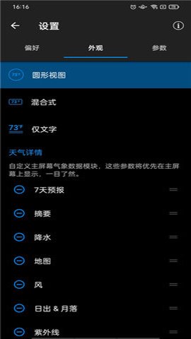 1、用户可以根据自己的喜好和需求,在界面排布设置中选择想要显示的天气参数,以便更好地满足个人需求。