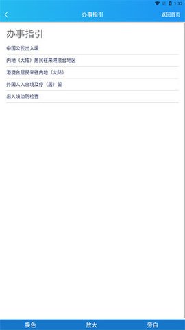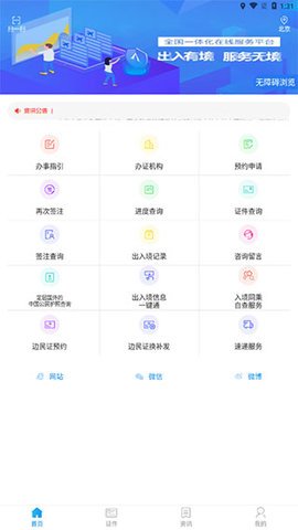 1、它主要为群众提供了一站式的便民服务,包括证件预约申请、往来旅游签注申办、证件进度查询、出入境记录查询、办证机构查询和办事指引查询等。