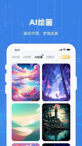2、它基于强大的AI智能技术,能够将用户脑海中的奇思妙想变成肉眼可见的艺术作品,只需几秒钟,就能得到一幅专属个人的画作。
