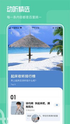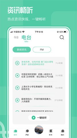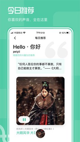 4、通过智能推荐算法和人工精选订制,你可以一站式聆听全国电台的节目,而且这款App更懂你的兴趣,会为你提供更加个性化的feed流音频节目。