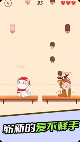 1、玩家要控制两只猫,一左一右,两只猫会从上面掉下来很多好吃的东西,等猫吃完了自己喜欢的东西,就会开始唱歌。