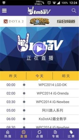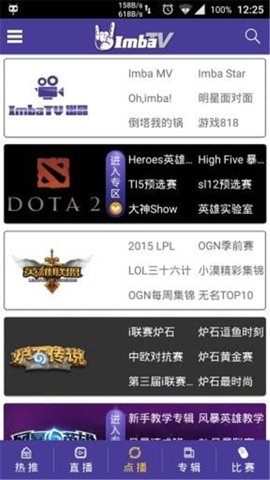 2、签约选手做主播,这里有海量的高清直播、比赛回看、赛事点播、赛事周边视频,imbatv自拍搞笑MV等360度全覆盖。