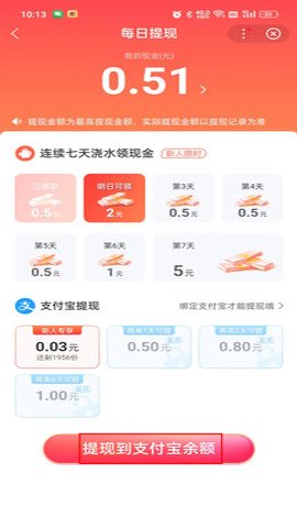 3、在每日提现页面,你可以直接选择提现金额,然后点击提现到支付宝即可完成体验。