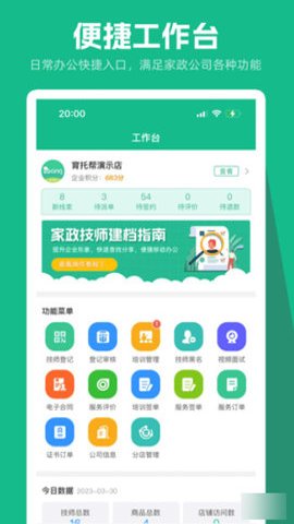 3、通过工作台,用户可以一目了然地看到全部的信息,如待派单、待签约、待评价等,同时还可以使用功能菜单进行操作。