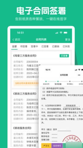 2、该APP提供了多种功能,包括家政体检、保险等,可以帮助广大企业更好地管理家政人员,并且可以直接在平台上签约。
