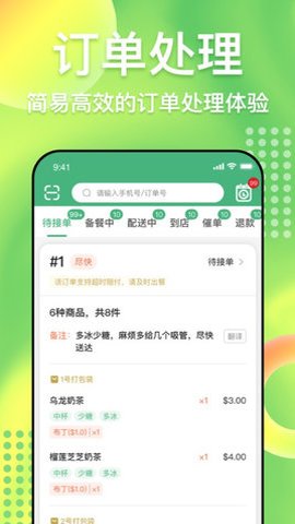 简单点商家版是一款应用,保证用户的外卖体验。它提供了极速配送和超时赔付服务,让用户可以享受到快速准时的外卖送达。如果您将餐厅搬到简单点平台,您将能够接收到海量的外卖订单,为您的餐厅带来更多的生意。我们对商家端进行了品牌升级,并对使用简单点商家端的商户表示感谢。通过手机快捷处理订单和管理餐厅,您可以轻松地管理您的店铺。我们提供了简洁易用的店铺管理体系,让您更加方便地管理店铺。并且我们的订单处理体验非常简易高效,可以让您更快速地处理订单。