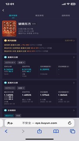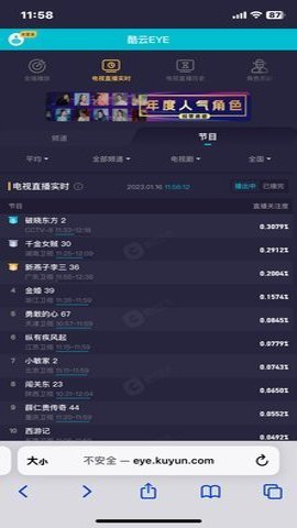 1、酷云eye收视率查询App还搜集了包括直播电视的实时收视率和历史收视率排行在内的一系列热度信息。