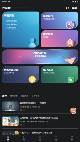 1、在大学通中,用户可以轻松查询到各种想知道的信息,如名校精品课程、毕业职业定向、考试需求对接、考研知识驿站、求职社区等。