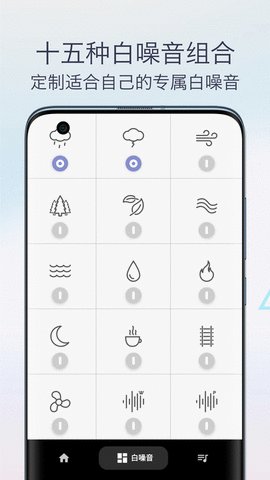 2、软件内涵盖了多种白噪音,通过丰富的白噪音为用户提供助眠效果。