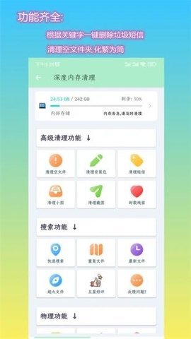 4、同时它还具有一些特色功能,如批量短信清理和文件查找等。