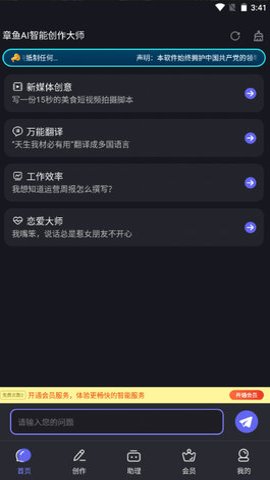 3、欢迎使用章鱼AI智能创作大师这款人工智能软件!它基于先进的技术,为用户提供丰富多彩的功能,让生活变得更加便捷和高效。