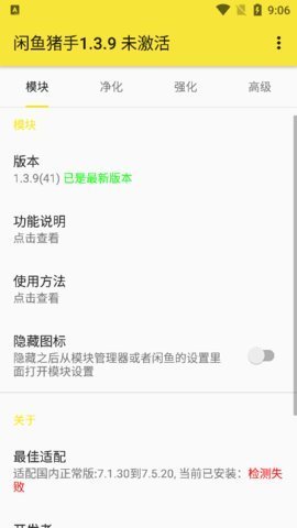 1、闲鱼猪手App不仅具有实用功能,还提供了开屏去广告、悬浮窗去除、净化首页、隐藏图标等功能。