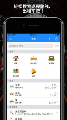 4、并且你还可以在主屏幕上搜索目的地,显示出最近车站的步行和出租车费用。