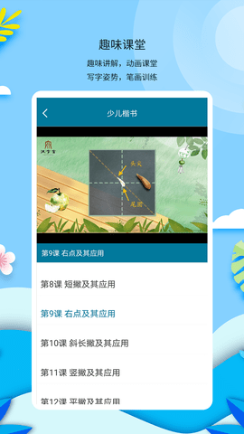 书法课堂是新汉字宫应用中的一个重要模块,每周一讲,共分为12个学期,涵盖了268个知识点。授课老师根据学生的需求和水平,可以灵活选择教学内容,4年级学习毛笔基本功,5年级学习欧体笔法等。这种个性化的教学方式有助于激发学生的学习兴趣,提高他们的学习效果。