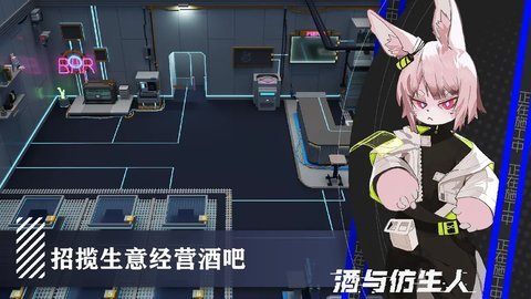 1、酒与仿生人是一款二次元赛博朋克模拟经营类手游,玩家将扮演一名酒吧老板,在游戏中挑战商业巅峰。