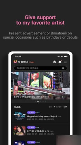 UPICK投屏是一款应用,为全球热爱K-pop艺术家和韩国演员的粉丝们提供了一个方便的平台。艺术家PICKplay推出了UPICK投屏,旨在让粉丝们可以更加便捷地支持自己喜欢的艺术家。通过UPICK投屏,粉丝们可以参与公开的众筹活动,为自己喜欢的艺术家在生日或出道等特殊场合张贴广告或进行捐款。此外UPICK投屏还提供了多种活动,如人气投票、社交社区、粉丝礼物等,让粉丝们能够更加全面地参与其中。