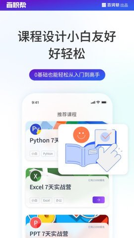 1、百职帮是百词斩旗下的职场技能学习APP,涵盖了夜曲编程、百职帮office以及百职帮数据分析等多类课程,旨在帮助更多的市场人学会自己想学的技能,实现职场理想。