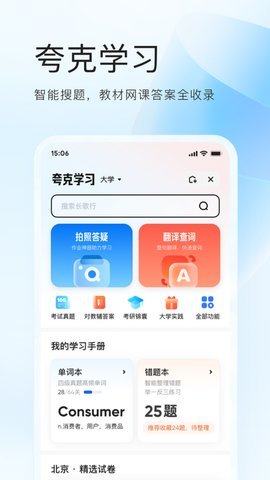 5、夸克大学通App还有一个【夸克学习】功能,可以通过拍照搜题目来解决各种学习。
