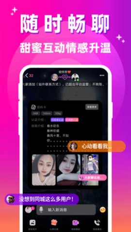 附近可聊App是一款非常不错的应用软件,它为单身男女提供了24小时在线聊天交友的平台。在这里,没有任何约束,用户可以自由搜索附近的人,为陌生的单身男女量身定制了一个零距离的聊天交友平台。这个平台上,你可能会邂逅到附近的人,与他们进行新颖的恋爱交友聊天。不仅如此,附近可聊还提供了同城交友、视频交友、附近交友、互动聊天等功能,为用户精心挑选出让他们心动的TA。