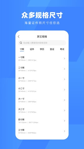 1、不仅如此,该应用还提供了多种证件照尺寸选择,包括一寸、二寸、身份证、驾照、护照等,满足了不同证件照的需求。