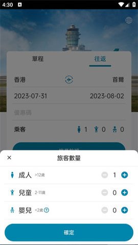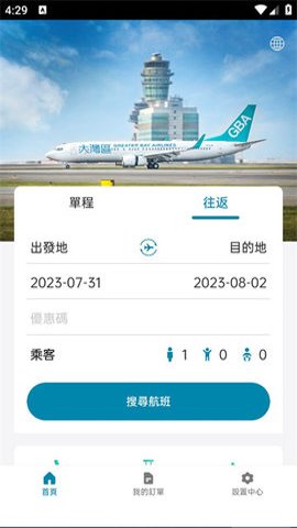 2、用户可以通过该App订购大湾区航空的飞机票,选择自己的出发地和目的地,一键查询最合适的航班和机票。