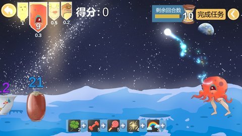 1、玩家需要通过使用不同的英雄和道具,控制不同的角度和力度,将小球精准地扔进瓶口,以收集不同分数的瓶子。