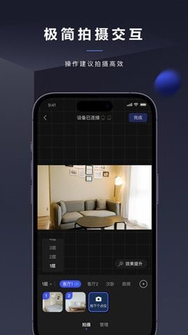 3、并且针对房产行业场景定制了拍摄引导,用户可以选择拍摄房源、楼层、房间,降低VR制作成本并实现全自动关联房源;同时也轻松支持各种场景的VR拍摄。