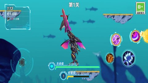 1、游戏中的机器人鲨鱼可以变换形态,成为超级动力的机械鲨鱼,在水中寻找各种猎物的身影。