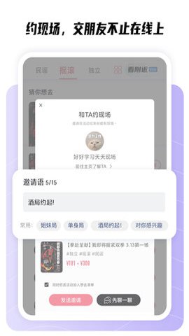 1、例如,约现场功能可以让用户在生活中遇到的小伙伴更加轻松地认识,避免了尬聊的尴尬情况。