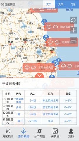 3、舟山海洋气象App以海洋气象服务为基础,为海洋航运提供专业的海区预报、港口预报、台风专题和传真图等服务。
