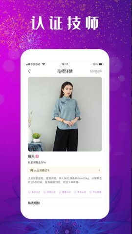 5、我们精心挑选了同城的专业技师,通过证书认证和人脸认证,保证按摩服务的品质。
