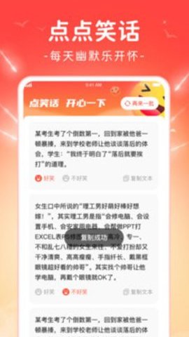 1、欢喜点点是一款综合性知识增长平台,它可以让用户学习诗词,增长知识水平,每天还有趣味段子和笑话推荐。