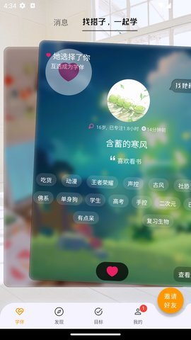 2、此外我们还推出了找搭子一起学功能,通过互选成为学习搭子,一起专注,一起进行音视频陪伴。