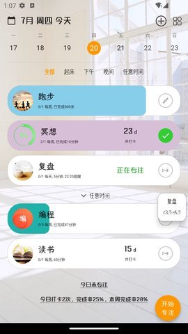 5、专注功能可以记录您一天的专注分布和目标达成情况,以及周期内的习惯养成情况。