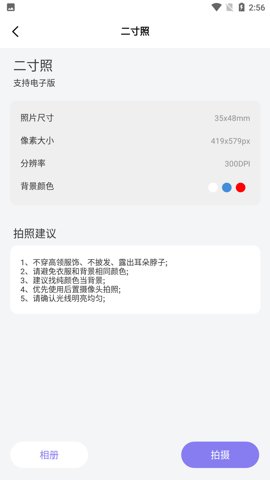 1、同时软件具有背景替换、尺寸调整等功能,只需按照要求拍摄照片,即可快速地制作出符合规格的证件照片。