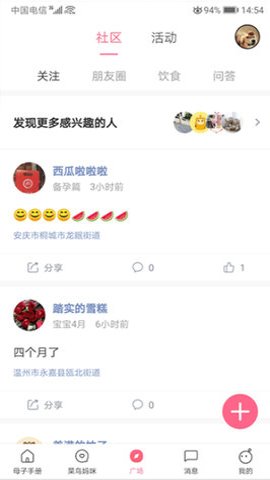3、社交圈也进行了升级,你可以添加好友关注,参与孕妇问答模块,并创建个人主页。