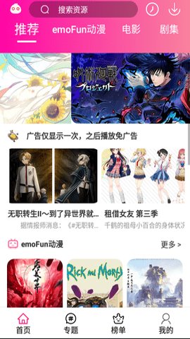 emoFun最新版是一款应用,题材众多,国产、日韩等任你看。它是一款免费追动漫、看动漫的高质量动漫app,并且已经为你去掉了广告,非常的纯净简洁。emoFun有海量的动漫资源供大家选择,无论是最新的还是最热门的统统都可以找到,可以满足用户在平台观看各种动漫的需求。